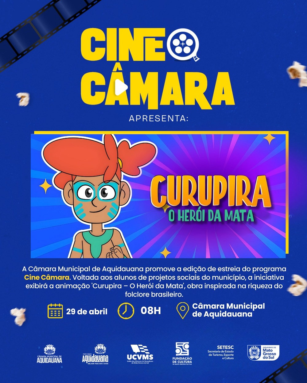 O lançamento oficial do projeto Cine Câmara em Aquidauana será nesta quarta-feira, dia 29, às 8 horas, no Plenário Estevão Alves Corrêa.