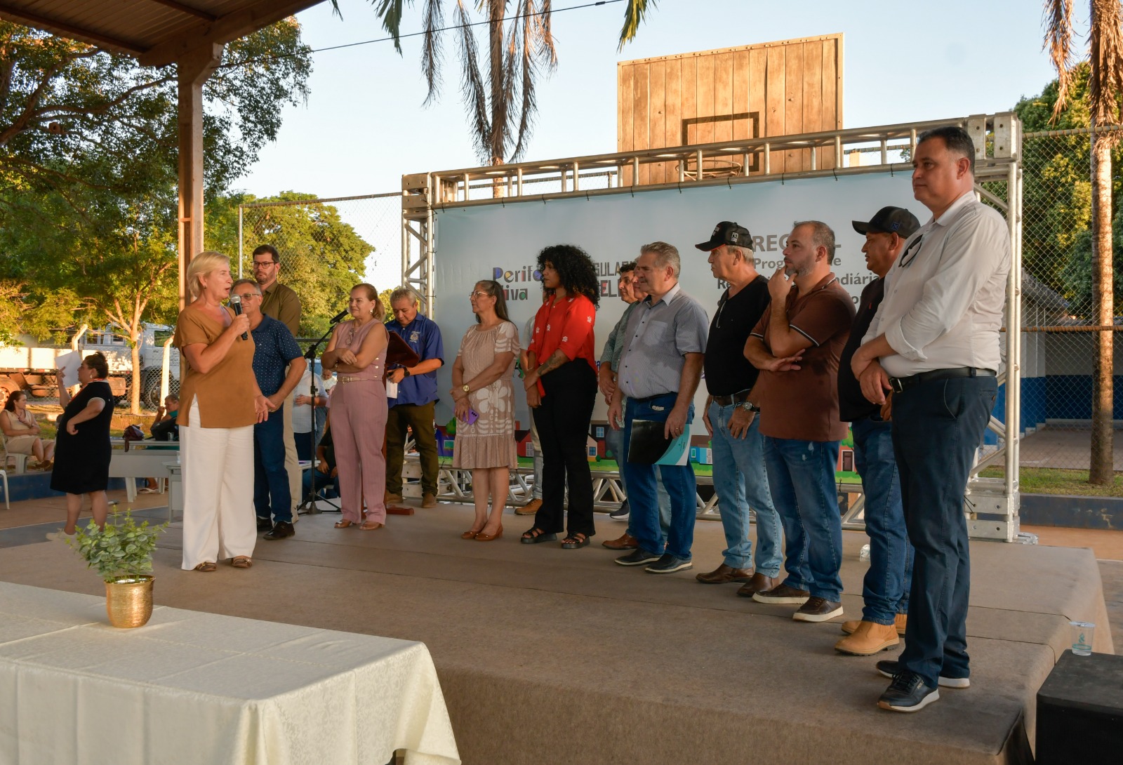 A solenidade foi realizada na Escola Municipal Ada Moreira Barros e contou com a presença de moradores contemplados, autoridades e representantes das instituições envolvidas. Participaram os vereadores Everton Romero (presidente da Câmara), Valter Neves (vice-presidente), Nilson Pontim (líder do prefeito), Marquinhos Taxista e Renato Bossay; o prefeito Mauro Batista; a representante do Governo Federal, Luana Alves; a diretora-presidente da AGEHAB, Maria do Carmo Lopes; além de secretários municipais e Ewerton Giovanni, representante da Legaliza Brasil.