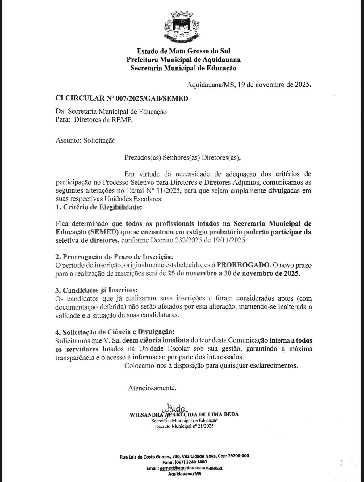 A Secretaria Municipal de Educação de Aquidauana publicou, na tarde desta quarta-feira, o Ofício Circular nº 007/2025 informando importantes mudanças no Processo Seletivo para Diretores e Diretores Adjuntos da Rede Municipal de Ensino. As alterações dizem respeito ao Edital nº 11/2025 e deverão ser amplamente divulgadas em todas as unidades escolares.
